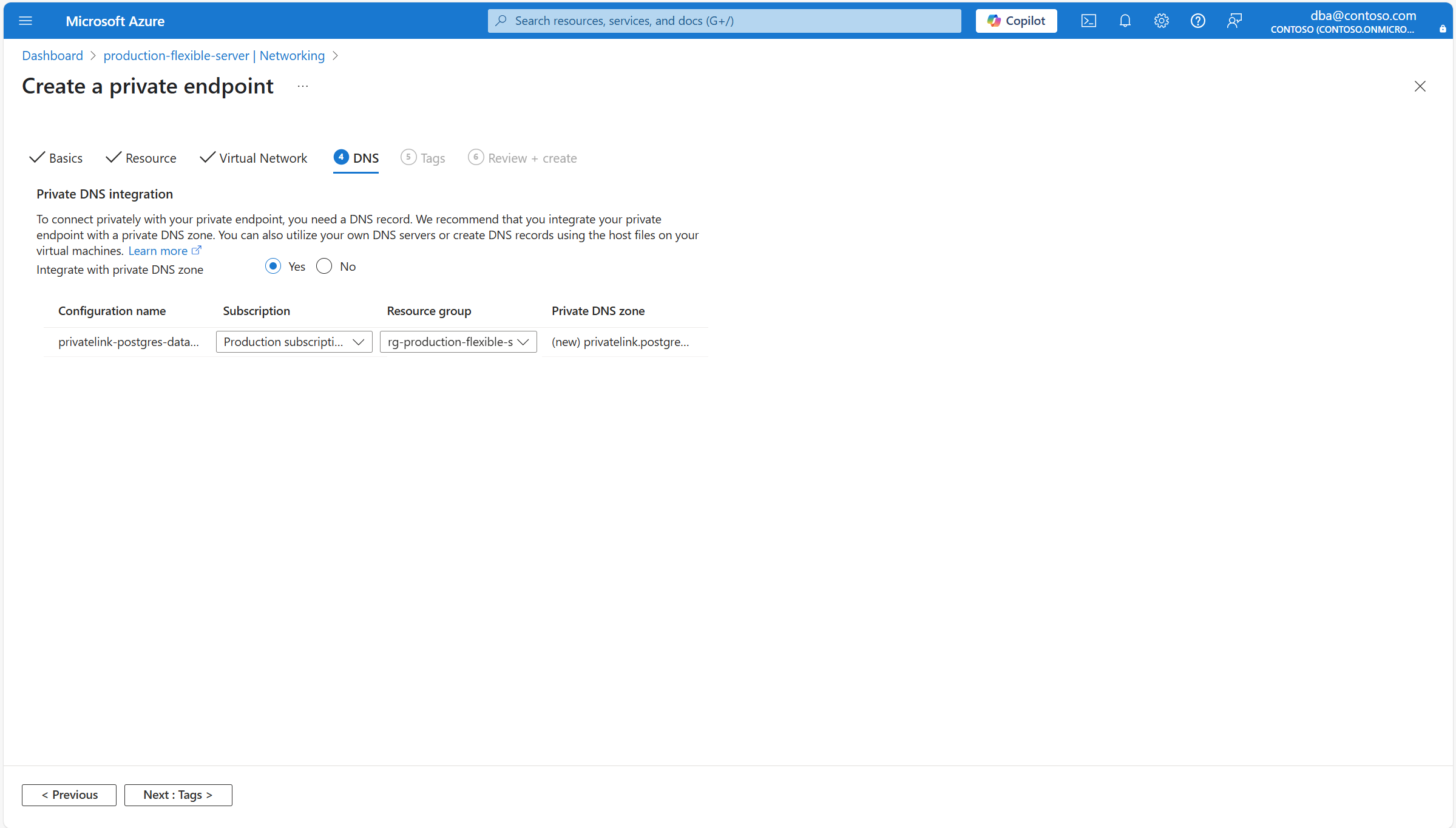 Private DNS zone Automatically set for you to privatelink.postgres.database.azure.com. This name is the one assigned to the private DNS zone resource.