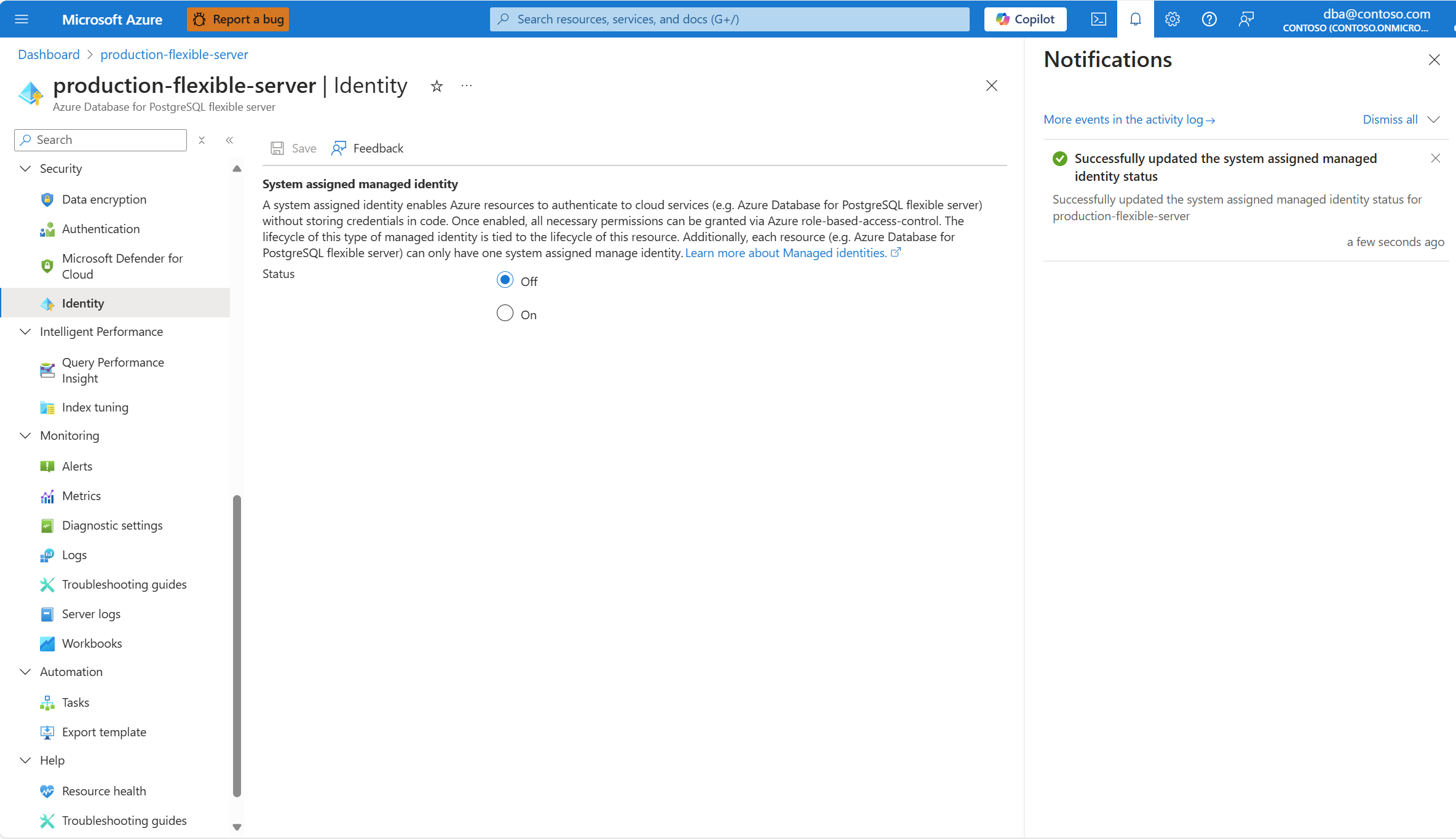 Screenshot that shows the notification informing that the system assigned managed identity is disabled.