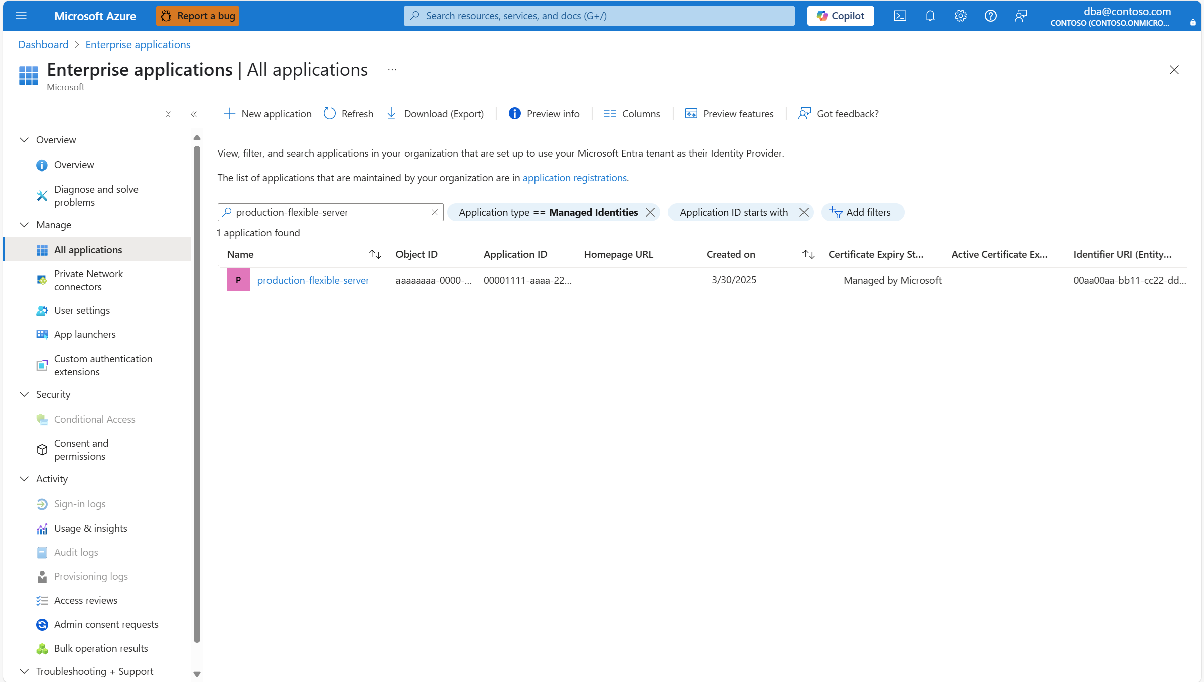 3. Provide the name of your instance of Azure Database for PostgreSQL flexible server instance in the Search by application name or object ID text box.