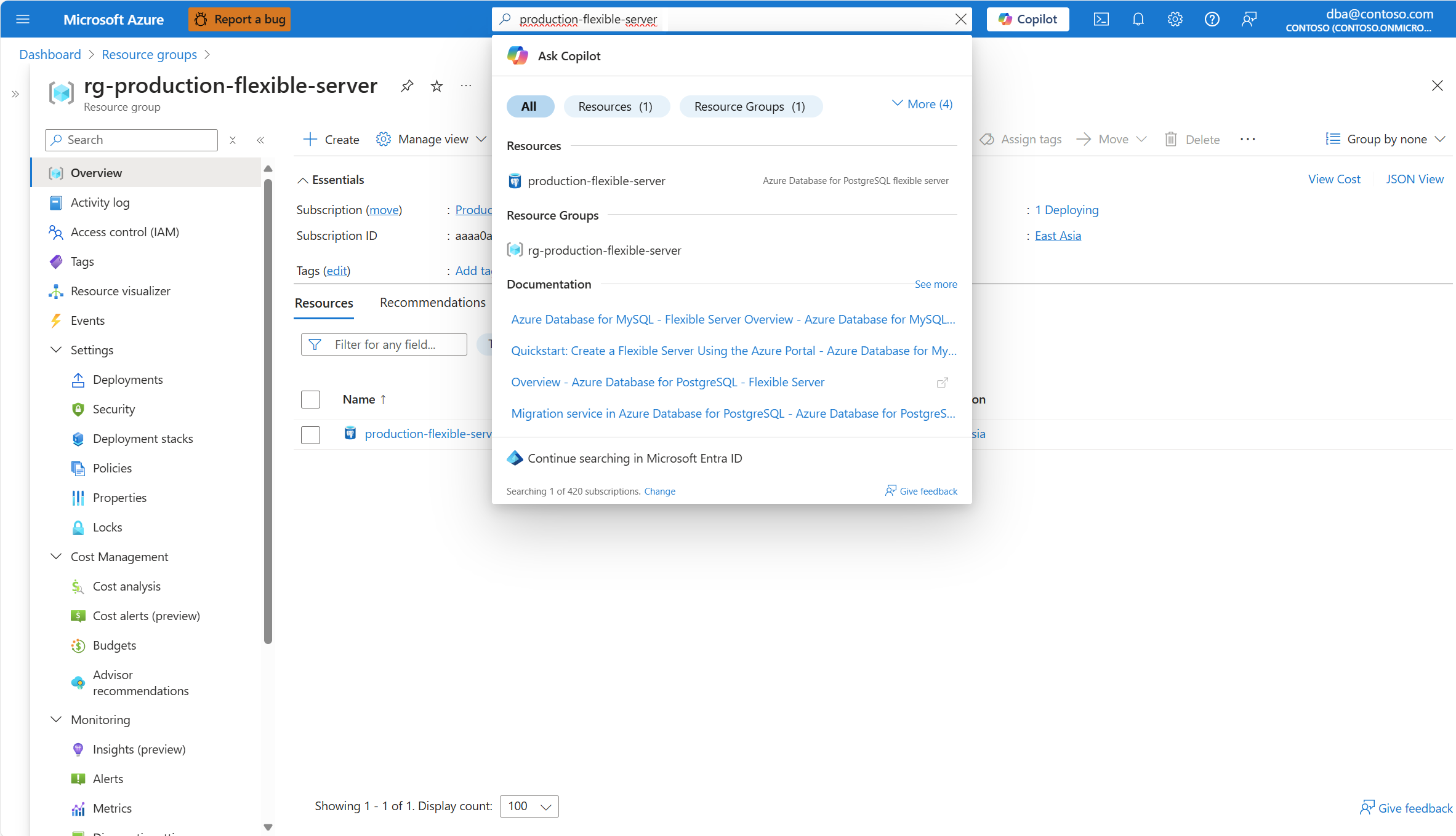 1. Locate your server in the portal, if you don't have it open. One way to do it is by typing the name of the server in the search bar. When the resource with the matching name is shown, select that resource.