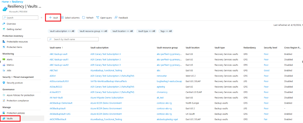 Complete the workflow. After the vault is created, it appears in the list of vaults in the Resiliency section. If the vault doesn't appear, select Refresh.