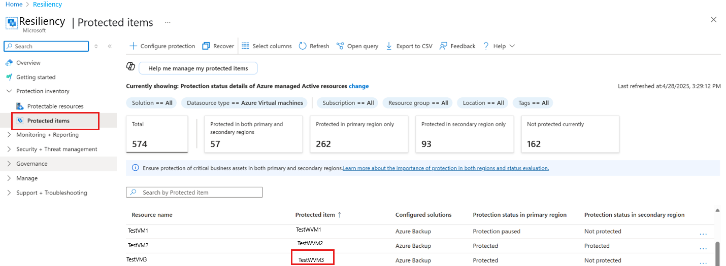 Go to Resiliency, and then select Protection inventory > Protected items.