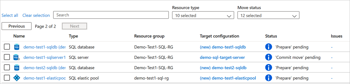 - If there's an elastic pool with associated databases in the Commit move pending state, you can't discard the elastic pool.