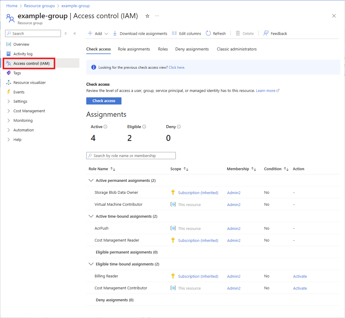 The following shows an example of the Access control (IAM) page for a resource group.