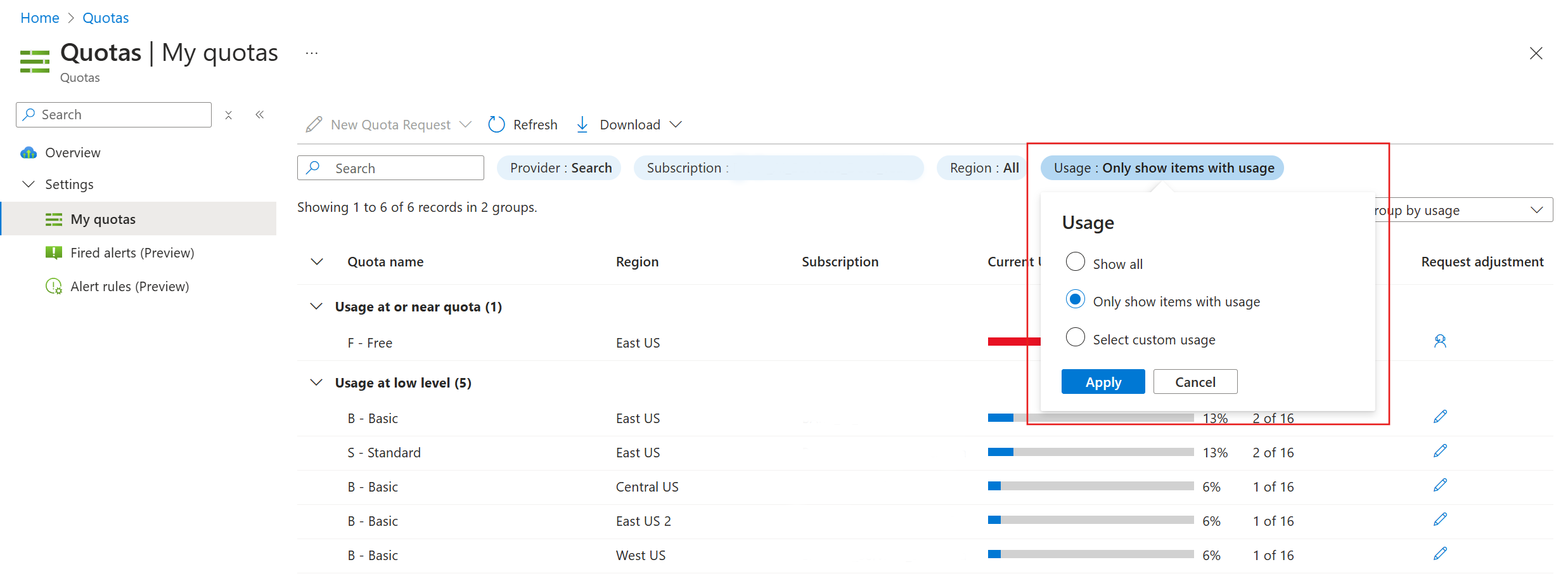 Set filters to review the existing quota for search services in your current subscription. We recommend filtering by usage.