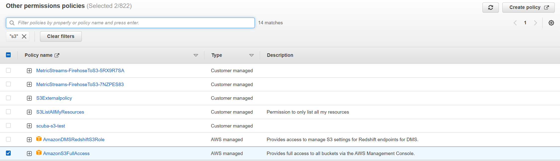 Search for the AmazonS3FullAccess and CloudWatchLogsReadOnlyAccess policies and attach them.
