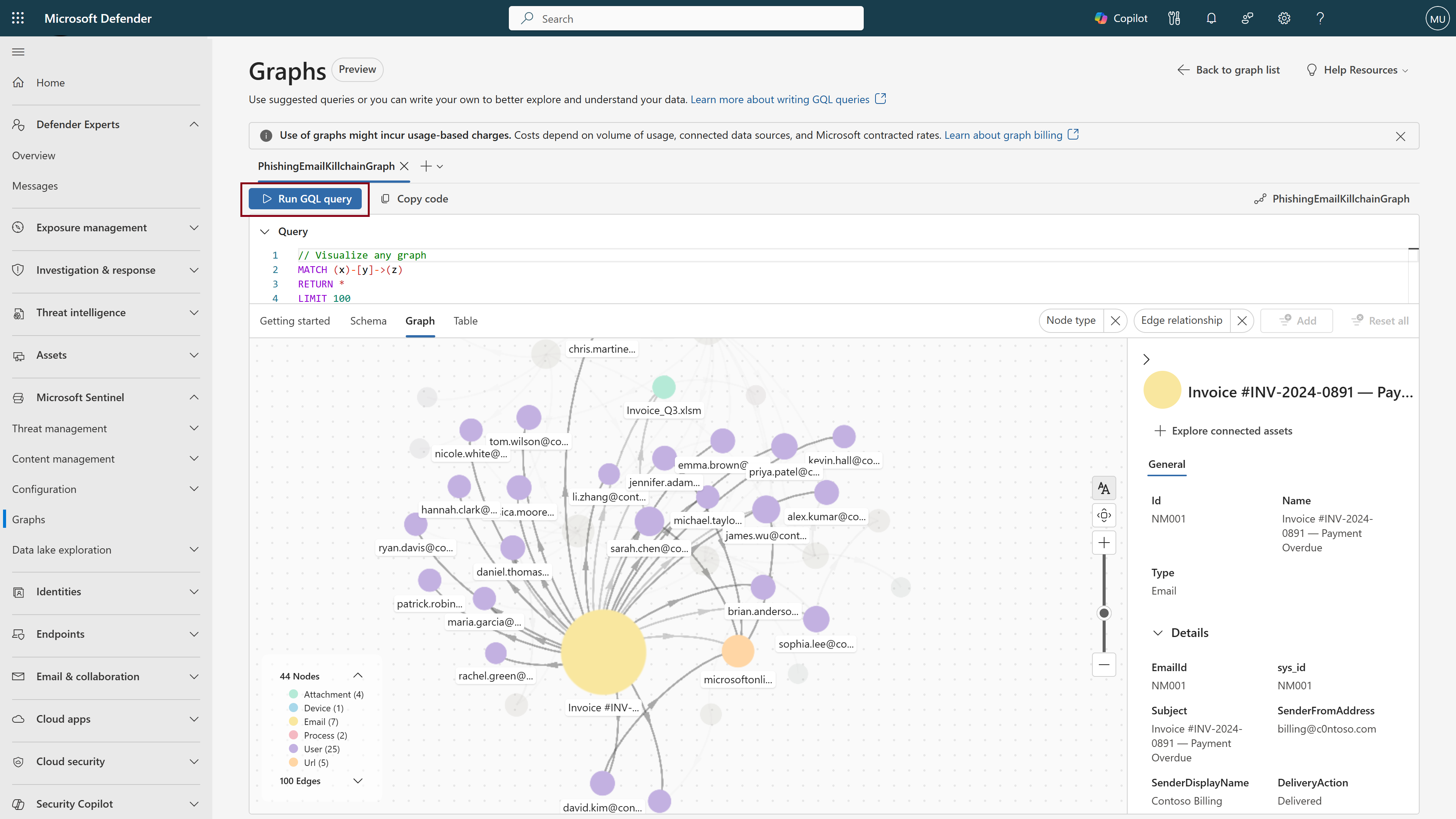 The graphs experience in the Microsoft Defender portal enables you to perform interactive graph-based investigations on your custom graphs, such as using a graph built for phishing analysis to help you quickly evaluate the impact of a recent incident, profile the attacker, and trace its paths across Microsoft telemetry and third-party data. This experience allows you to run graph queries to visualize the insights that matter most to your organization and supports ad hoc traversal of the graph so you can quickly investigate entities of interest. You can study the graph schema to understand the relationships defined on your graph and use any of the displayed metadata to narrow down your results. You can quickly validate your results with the table view and export them for easy integration into any preexisting workflows. Use Jupyter Notebooks in Microsoft Visual Studio Code to create and materialize your custom graphs, then use the graph experience in Microsoft Sentinel to query and visualize your custom graphs.