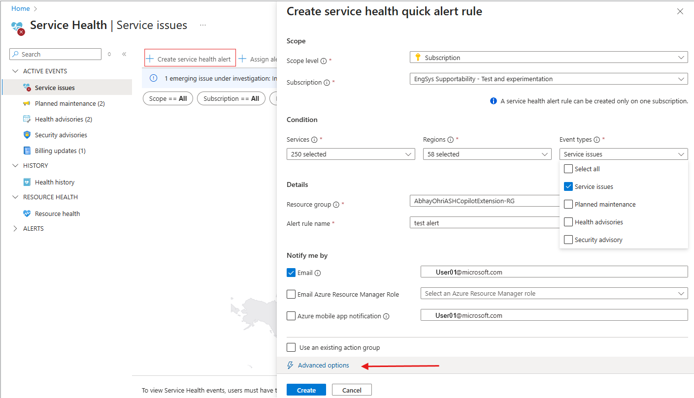 1. Select Create to finish the alert. If you want to add more detailed information for the service health alert, select Advanced Options to add more information to your alert.