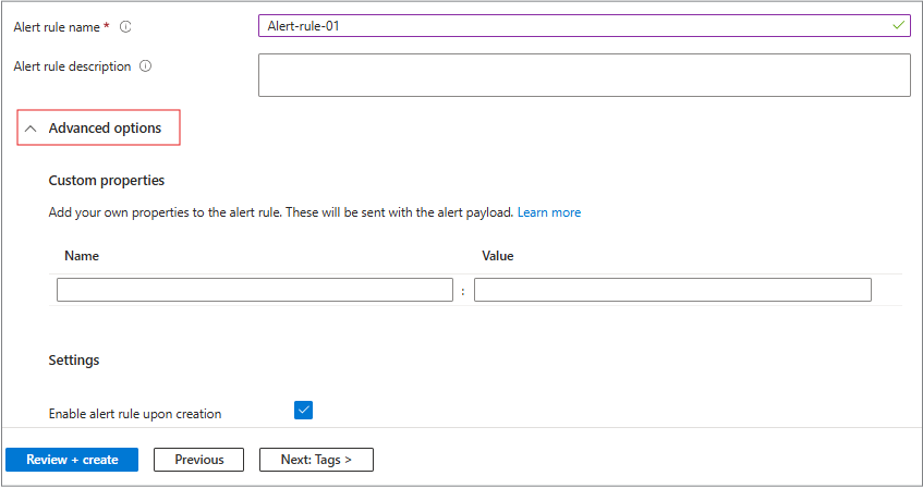 Here you can select Advanced options to set up your own Custom properties to the alert. Screenshot of the Advanced settings section.