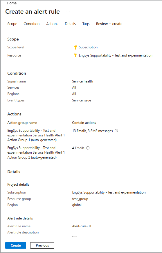 The Review + Create tab lets you review everything you selected. When you're ready, select Create to finish and create the alert.