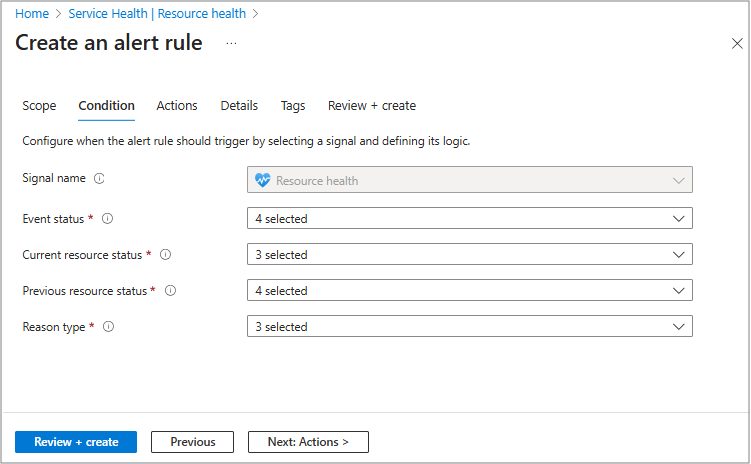 Use this tab to choose what triggers your alert. Set it to watch for changes in resource health status (Unavailable or Degraded), event status (Active or Resolved), or specific reason types (platform vs. user actions).
