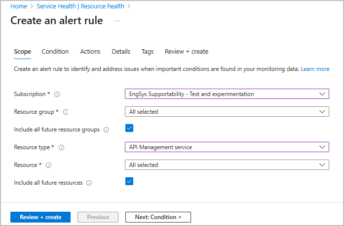 Scope defines which resources your alert monitors. On this tab, select the subscription, resource group, or individual resources that matter most to your business. Resource health alerts only trigger for the resources you include in the scope.