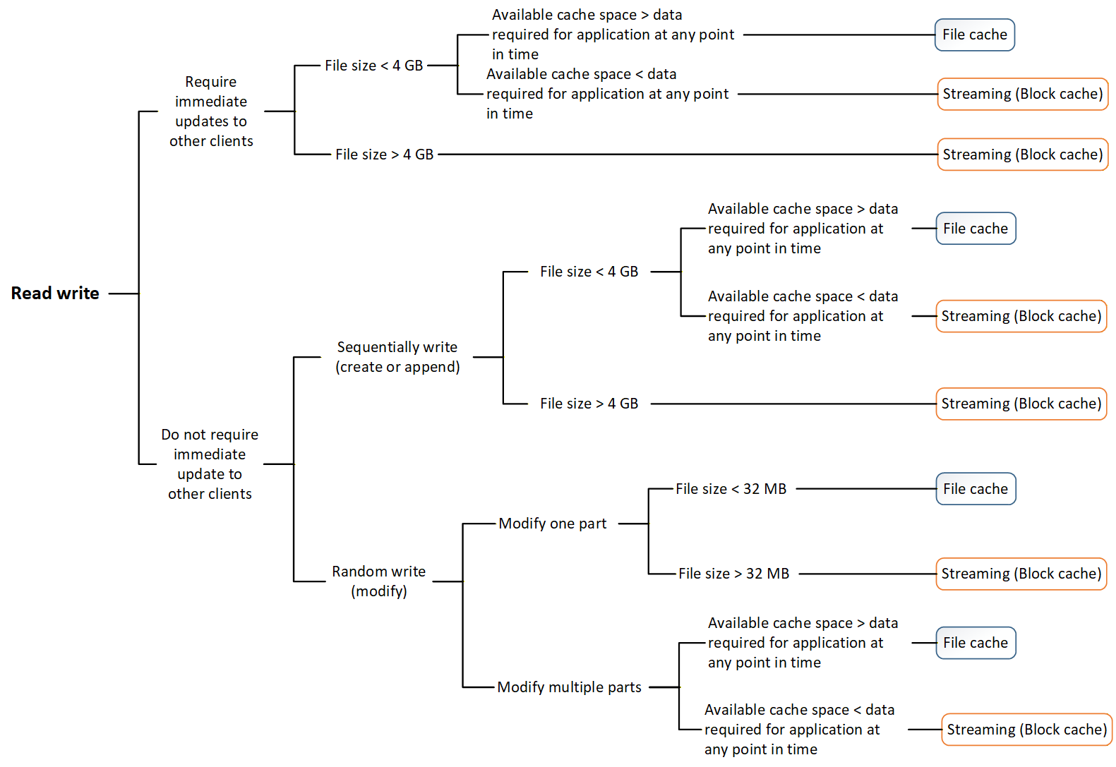 Diagram that shows how to choose between block cache and file cache mode for read-write workloads.