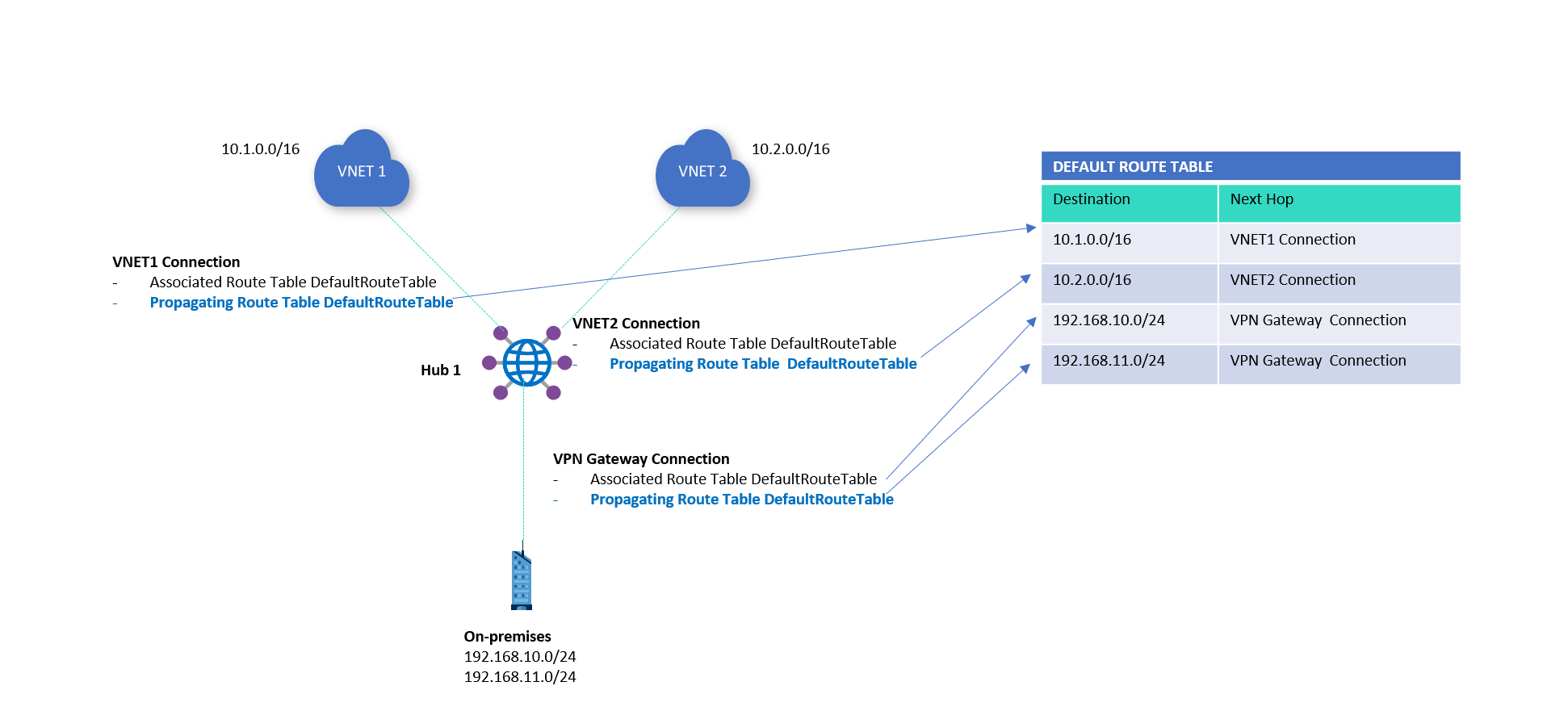 Connections dynamically propagate routes to a route table. With a VPN connection, ExpressRoute connection, or P2S configuration connection, routes are propagated from the virtual hub to the on-premises router using BGP. Routes can be propagated to one or multiple route tables.