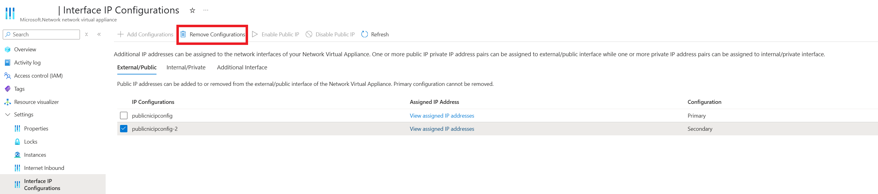 You can allocate additional IP addresses to your NVA NICs by creating additional IP configurations and associating it to your NVAs NICs. These additional IP configurations are called secondary IP configurations.