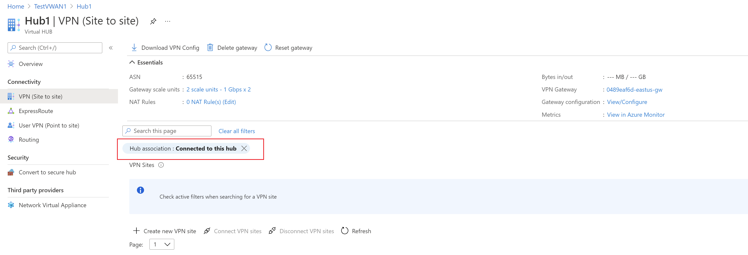 7. Go to your Virtual WAN. On the VPN sites page, you should be able to see the site you created. If you can't see the site, you need to adjust the filter. Click the X in the Hub association: bubble to clear the filter.
