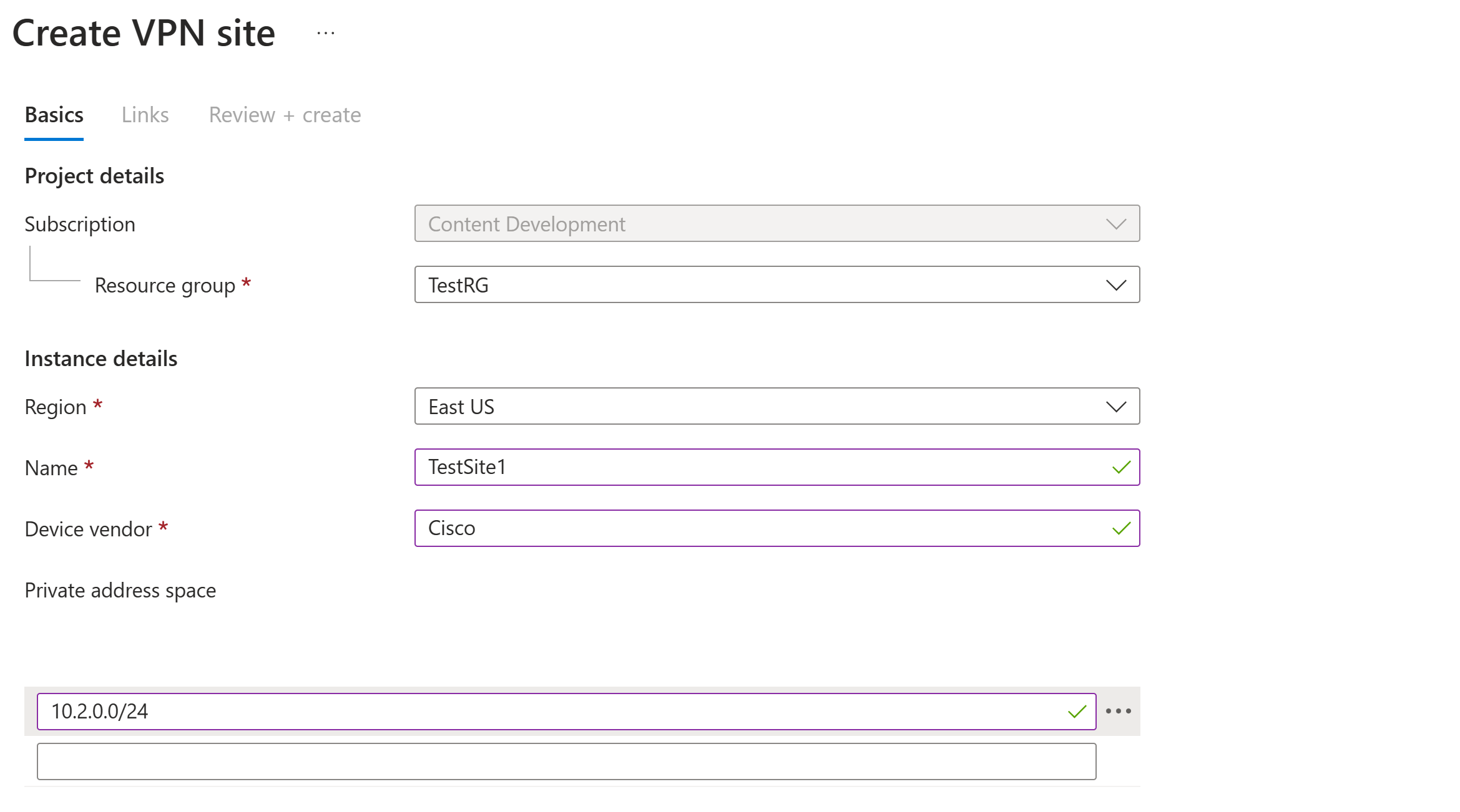 3. On the Create VPN Site page, on the Basics tab, complete the following fields: