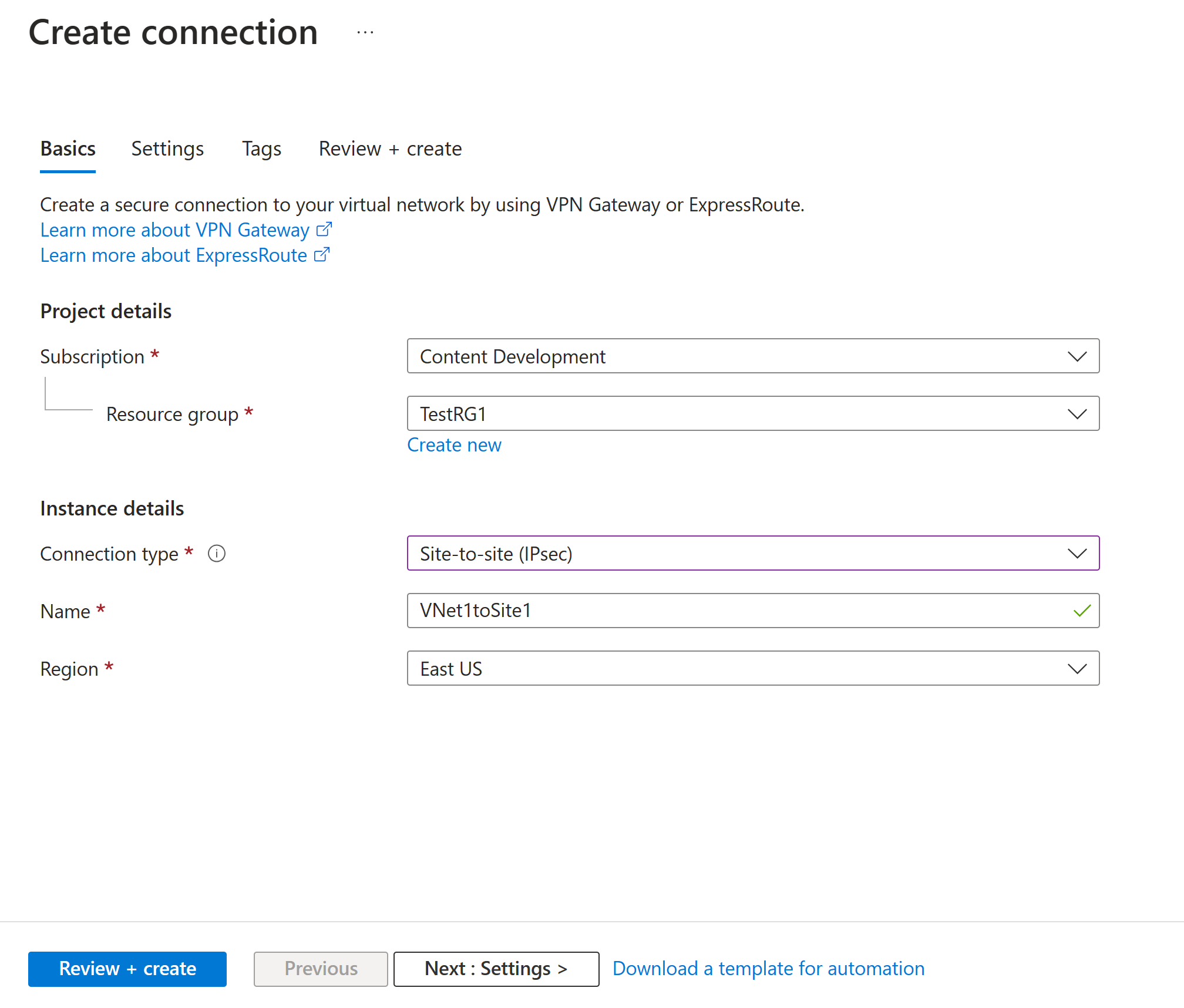 • Resource group: TestRG1