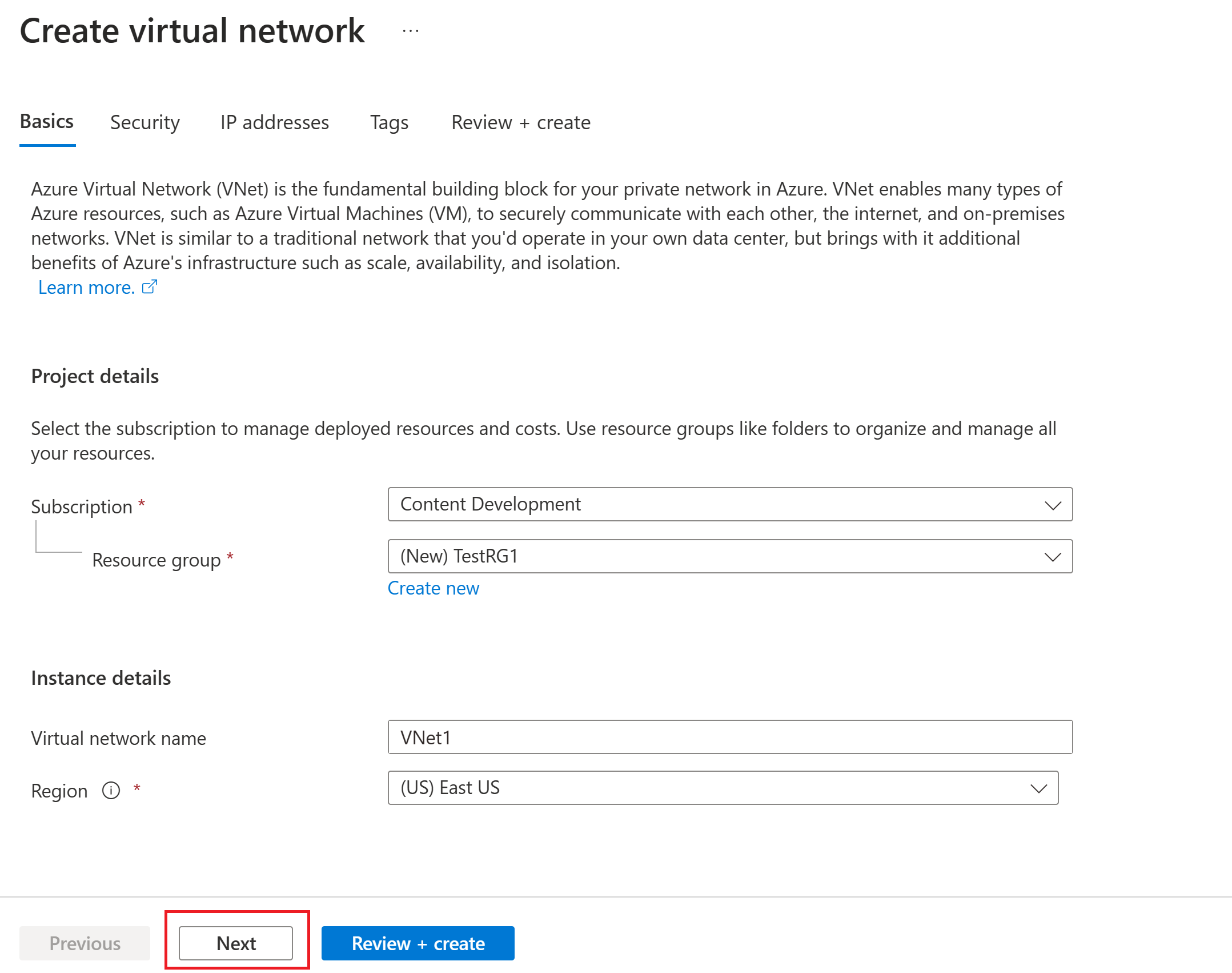 3. On the Virtual network page, select Create to open the Create virtual network page.