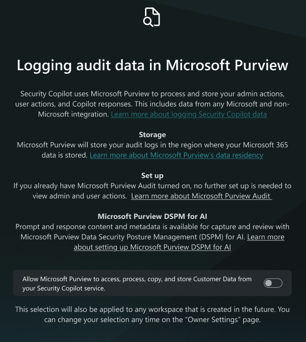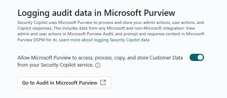 To enable Purview DSPM for AI and UAL solutions for Security Copilot, the capability must be enabled within Security Copilot and configured within the respective Purview solutions. There are two options to enable the capabilities within Security Copilot. Initially, during the first run experience, a Security Administrator may opt into allowing Microsoft Purview to access, process, copy and store administrator actions, user actions, and Copilot responses. For more information on getting started with Security Copilot see Get started with Security Copilot.