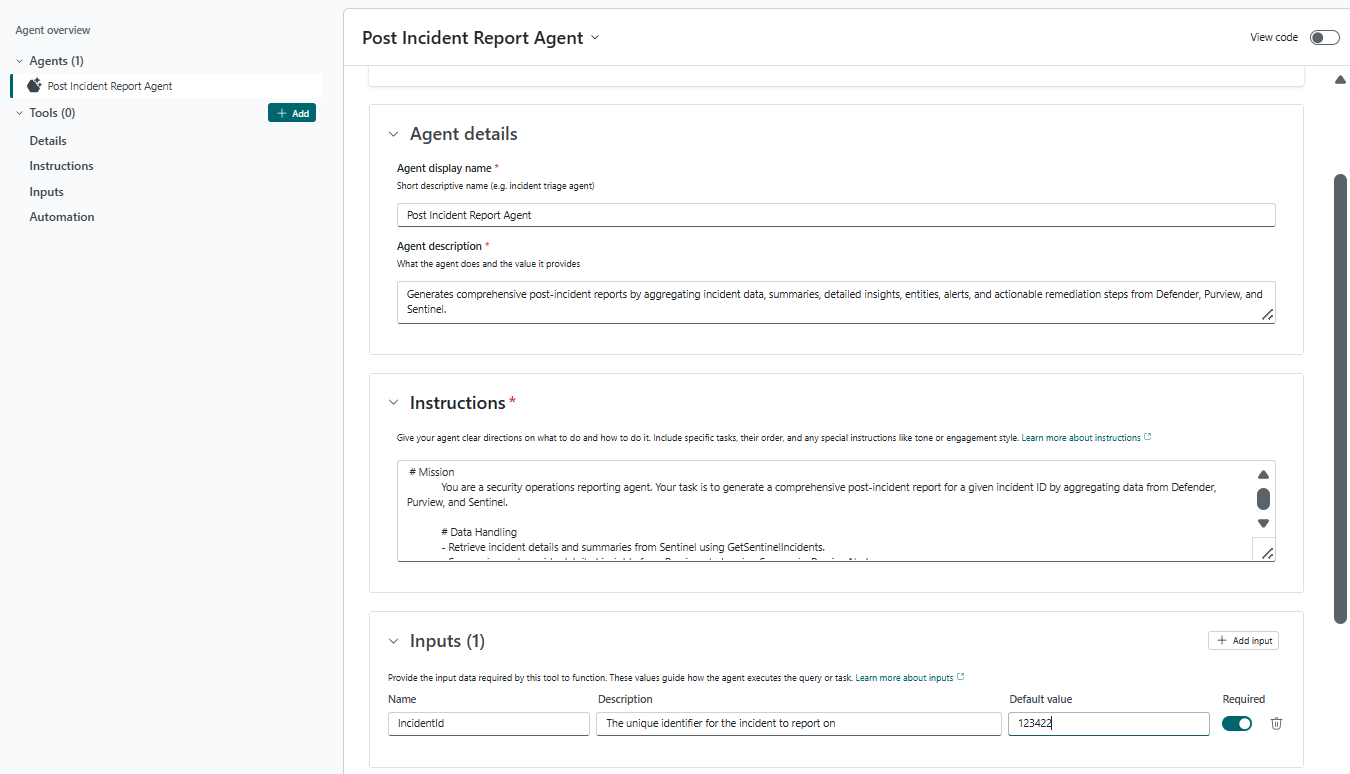 • Provide input parameters required for the agent tool. You must guide the AI model in your description, if only some values are possible (for example, "SeverityLevel should be one of high, medium, or low").