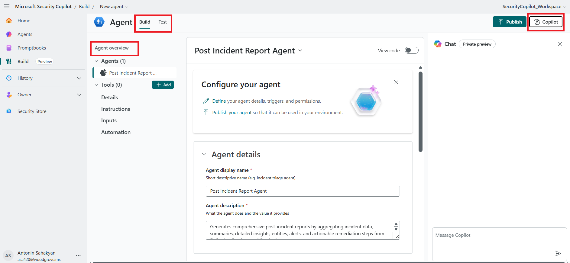 Image of the agent overview and the chat interface in Security Copilot
