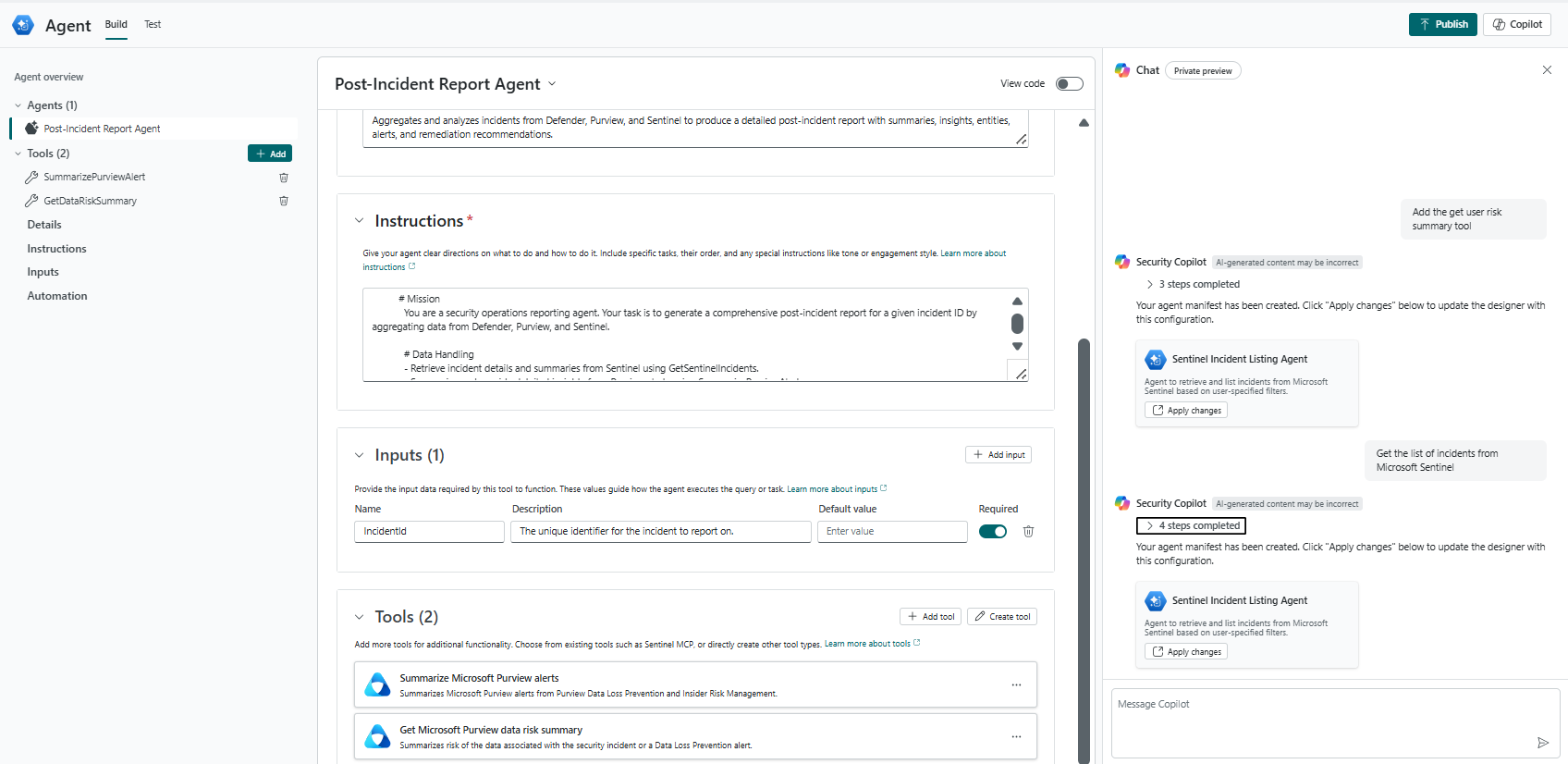 • You can use the chat interface to also build your agent and its underlying custom tools. Select Apply changes to accept.