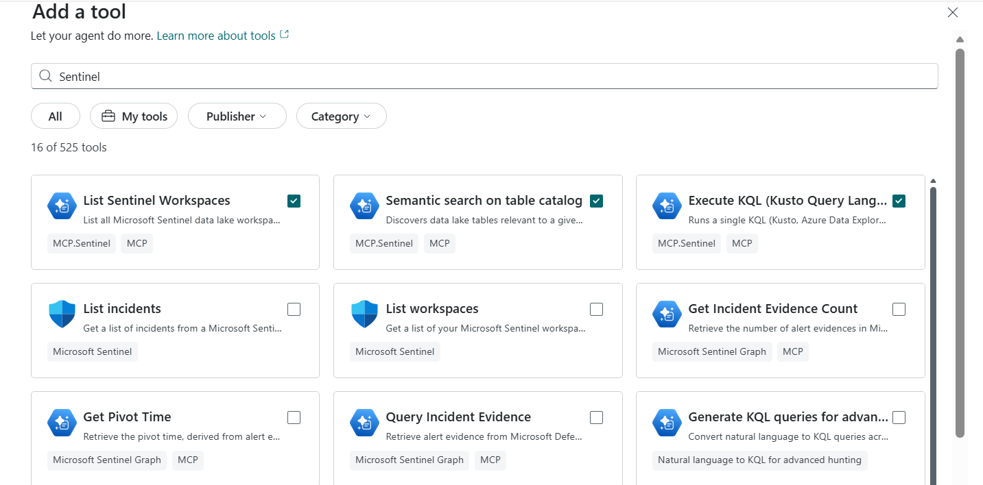 • Search: You can search for the tool in the Search bar (semantic search). The agent uses these skills or tools to accomplish a specific task. You can apply filters to improve discoverability for search. For example, to add Microsoft Sentinel's collection of MCP tools, search by the keyword or filter by Publisher: MCP.Sentinel.