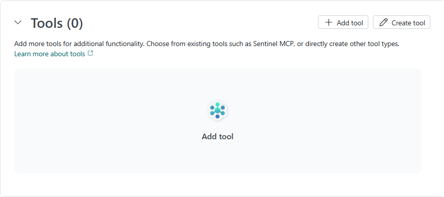 Select Add tool from the extensive Security Copilot tools catalog or select Create tool that enables your agent to perform specific tasks and interact with external systems.
