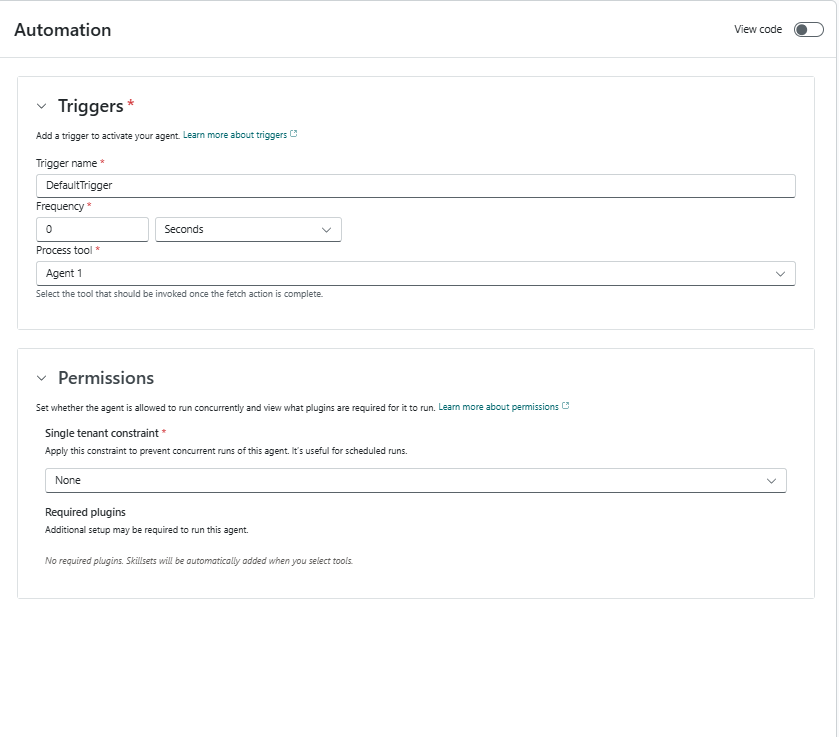 • You can toggle View code to see the code editor displaying the autogenerated agent code in a YAML format.