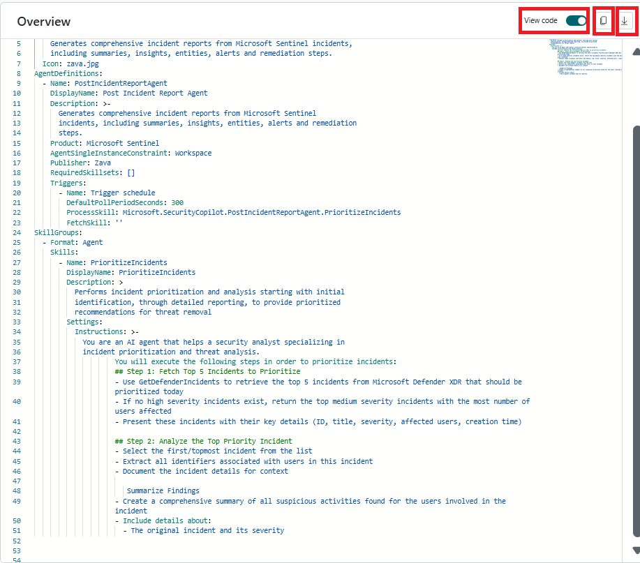 Image of the agent code autogenerated as YAML in Security Copilot