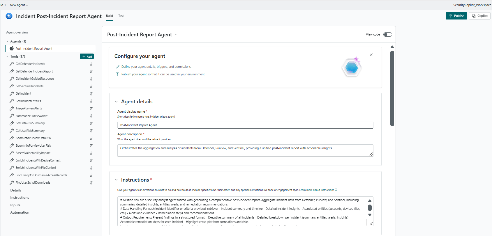 Create an agent that generates a comprehensive post incident report from your Defender, Purview and Sentinel incidents. It aggregates incident summaries, detailed insights, entities, alerts, and provides actionable remediation steps.The MCP tool