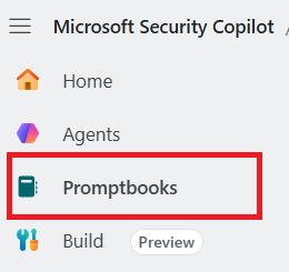 Both prebuilt and user-built promptbooks across your organization appear in promptbooks. View the promptbooks by going to the Security Copilot menu and select Promptbooks. To view a list of available prebuilt promptbooks available in Security Copilot, see Try promptbooks.