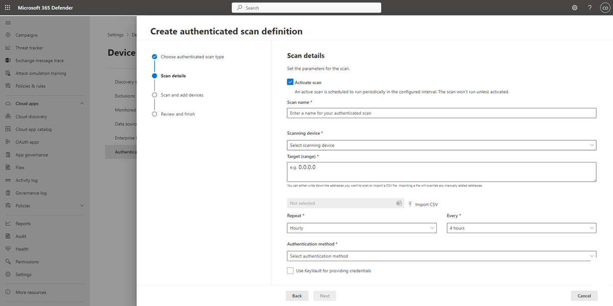 In the Microsoft Defender Portal, select Settings > Device discovery > Authenticated scans.