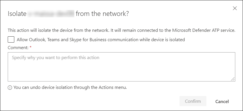 The device isolation feature disconnects the compromised device from the network while retaining connectivity to the Defender for Endpoint service, which continues to monitor the device. On Windows 10, version 1709 or later, you can use selective isolation for more control over the network isolation level. You can also choose to enable Outlook and Microsoft Teams connectivity.