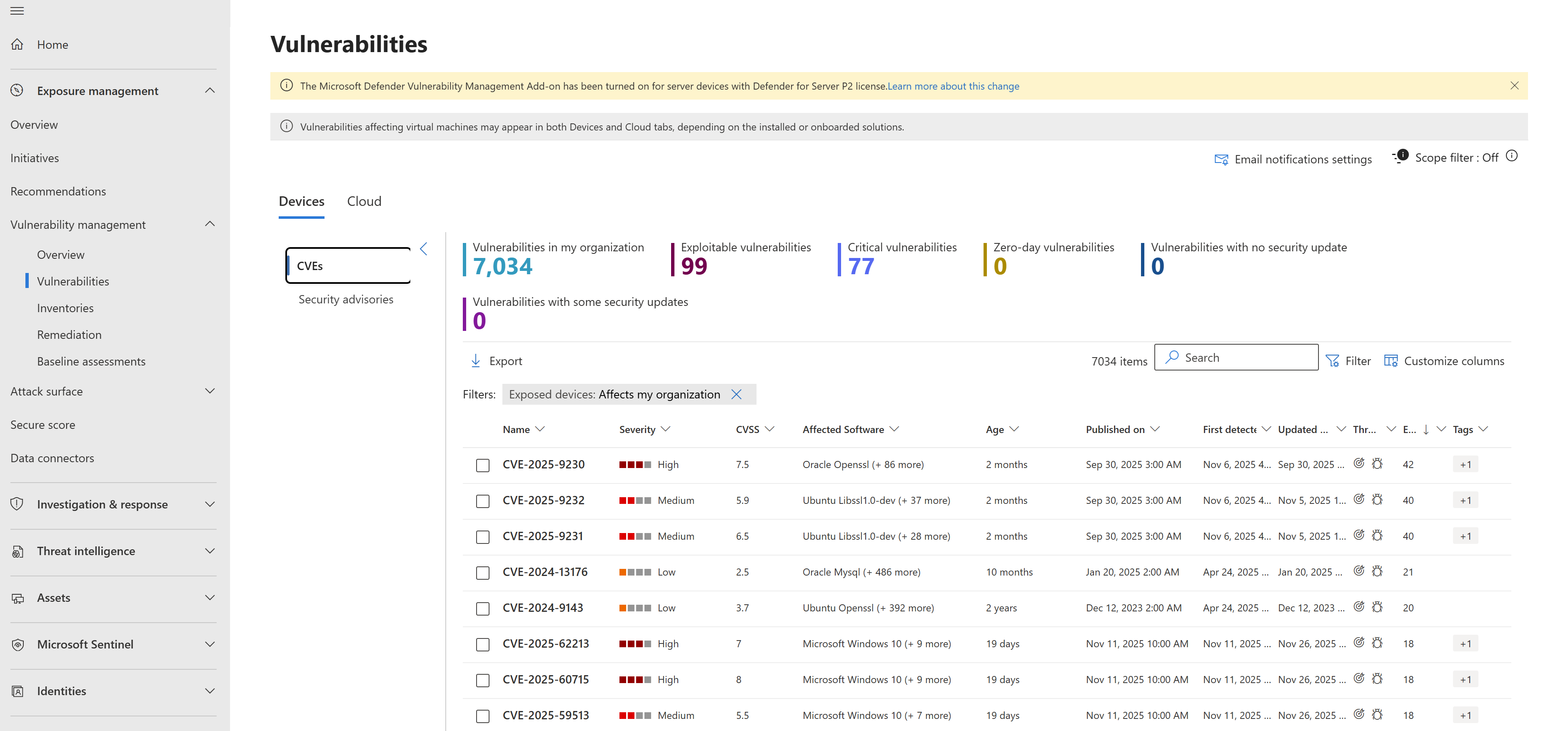 With Microsoft Defender Vulnerability Management, you can view Common Vulnerabilities and Exposures (CVEs), which allows you to identify and prioritize vulnerabilities in your organization. This might be available on the Vulnerabilities or Weaknesses page, depending on if you're an XDR/MDI Preview customer. For more information, see Microsoft Defender Vulnerability Management and Microsoft Security Exposure Management integration.
