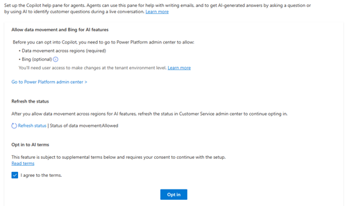 Learn more in Tenant settings and FAQ for optional data sharing for Copilot AI features in Dynamics 365 and Power Platform.