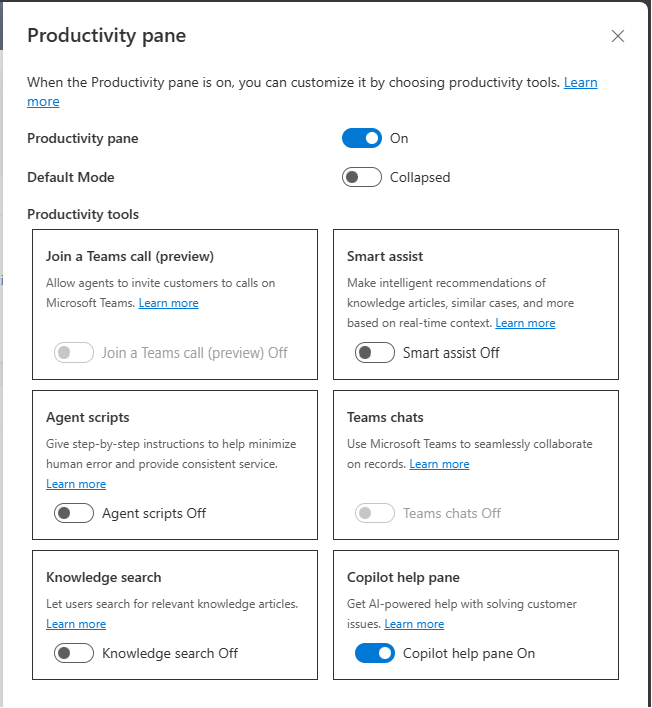 3. On the Productivity pane, turn on the Copilot toggle so that representatives can use the Copilot features such suggest a response, ask a question, and write an email on the productivity pane.