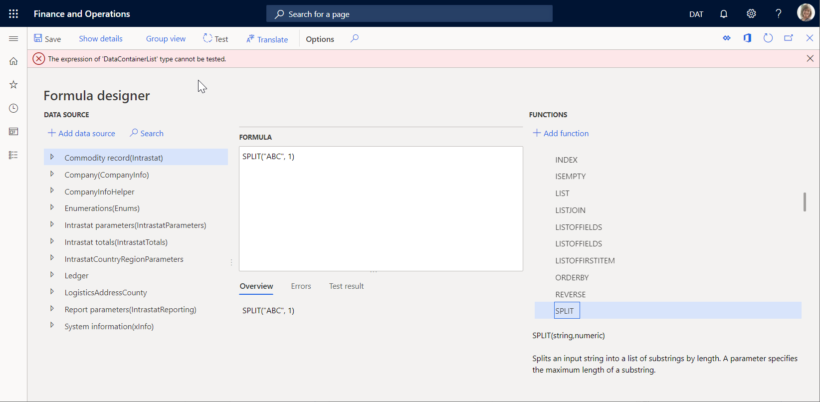 Some formulas can't be tested at design time. For example, a formula might return a result of a data type that can't be shown on the Test result tab. In this case, you receive an error message that states that the formula can't be tested.