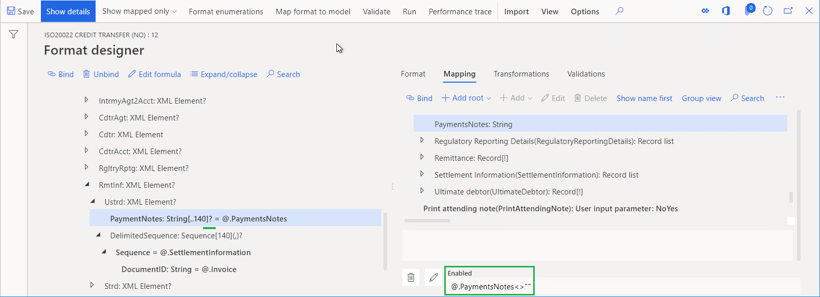 The ER formula designer can be used to configure expressions that control what data will be put into generated electronic documents at runtime. The expressions can enable or disable the output of specific elements of the format, depending on processing data and configured logic. These expressions can be entered for a single format element in the Enabled field on the Mapping tab of the Operations designer page. You can enter the expressions as a logic condition that returns a Boolean value: