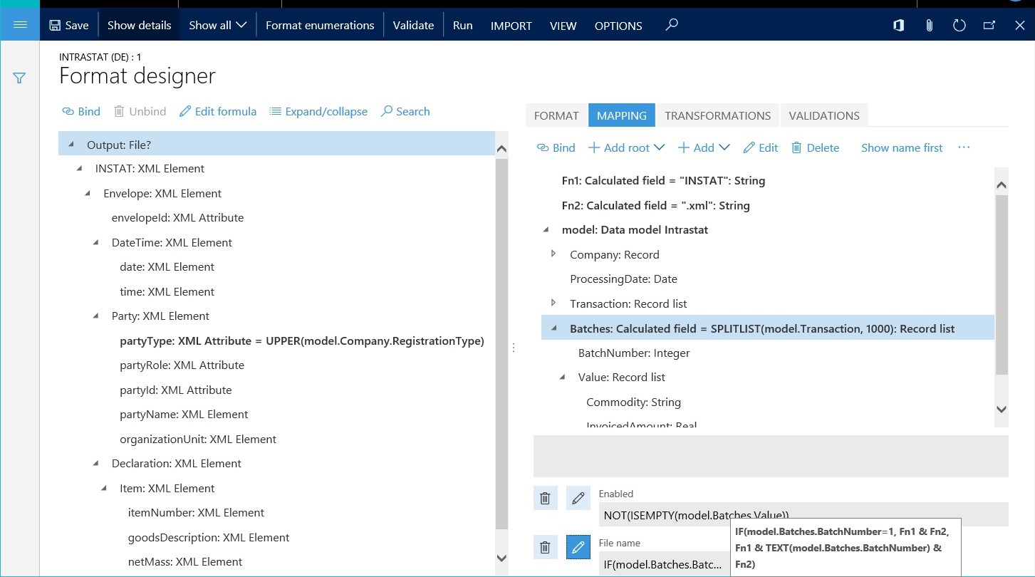 At runtime, the designed formula, ROUND (Intrastat.AmountMST, 2), rounds the value of the AmountMST field for each record in the Intrastat table to two decimal places. It then enters the rounded value in the Transaction.InvoicedAmount component of the Tax reporting data model.