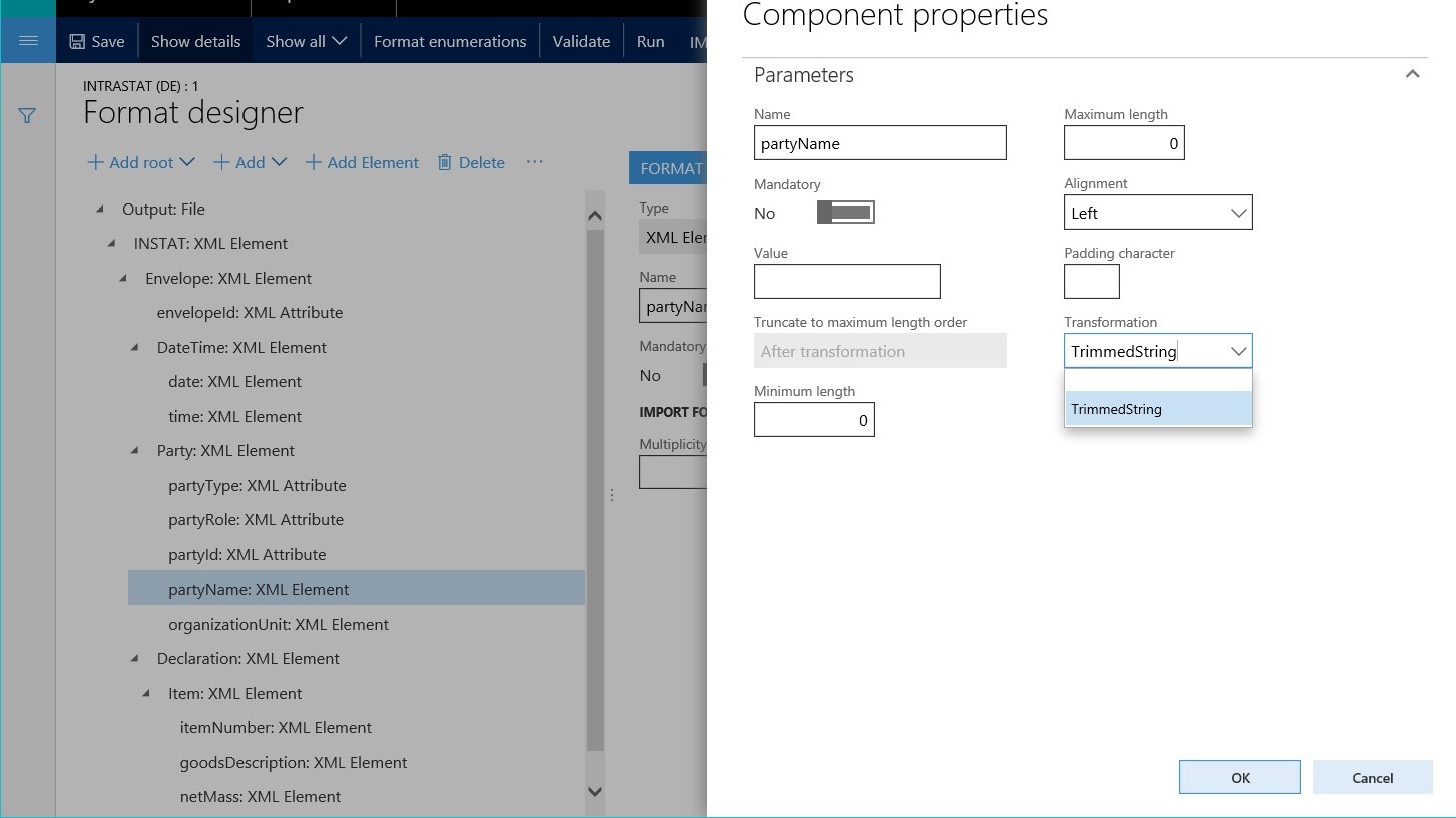When format components, such as the partyName component in the preceding illustration, refer to the TrimmedString transformation, the transformation sends text as output to the generating electronic document. This text doesn't include leading and trailing spaces.
