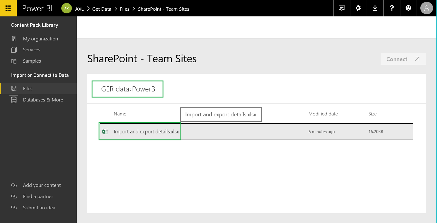https://ax7partner.litware.comin our example).Browse to the /Shared Documents/GER data/PowerBI folder, and select the Excel file that you created as the source of data for the new Power BI dataset.