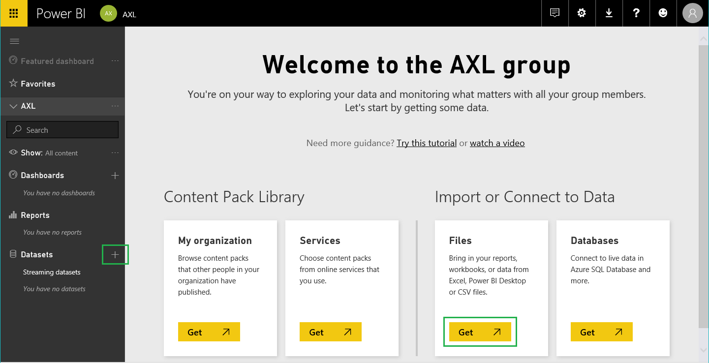 Sign in to Power BI, and either open an existing Power BI group (workspace) or create a new group. Either click Add under Files in the Import or Connect to Data section, or click the plus sign (+) next to Datasets in the left pane.
