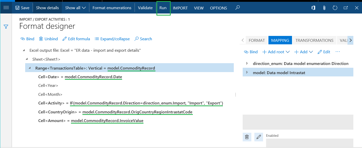 After it's run, the ER format generates the output result in Excel format. It sends the details of the Intrastat transactions to the output result, and separates them as transactions that describe either import activities or export activities. Click Run to test the new ER format for the list of Intrastat transactions on the Intrastat page (Tax > Declarations > Foreign trade > Intrastat).