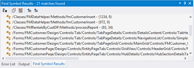 During build operations, the tools generate cross-reference information that you can use to show how elements are used. You can right-click an element and then select Find References to display a list of the locations where that element is used. When you select one of the items in the list, the designer for the element opens.