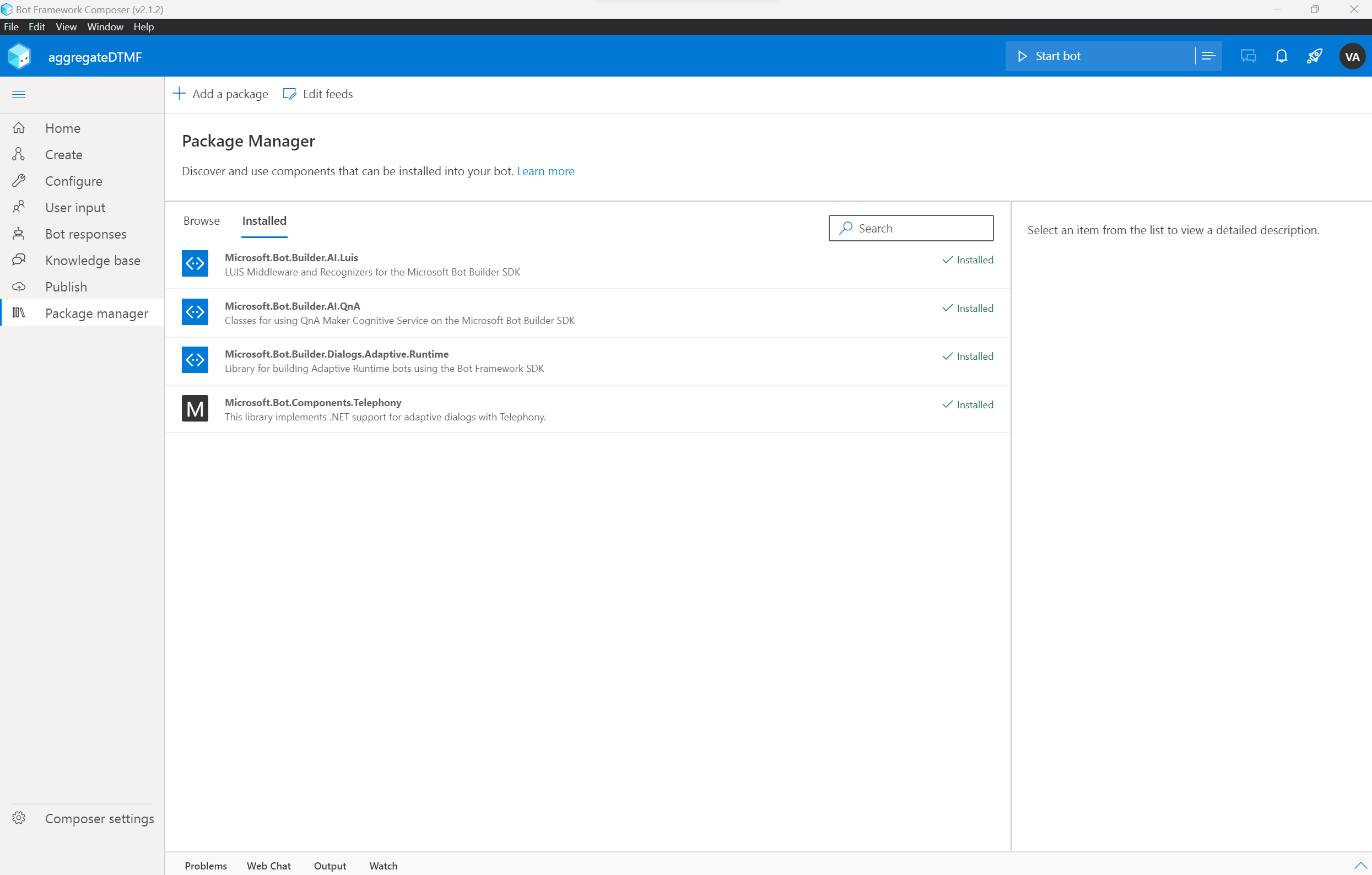 After this, you'll be taken to the composer authoring canvas, which is similar to that in Copilot Studio. In this sample, the Telephony Package extension is used. From the left nav of the Composer UI, choose Package Manager, and from within that UI go to Installed tab.