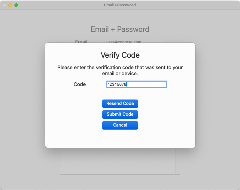 This guide tests Email and password usage. Enter a valid email address and password, select Sign Up, and launch the submit code screen: