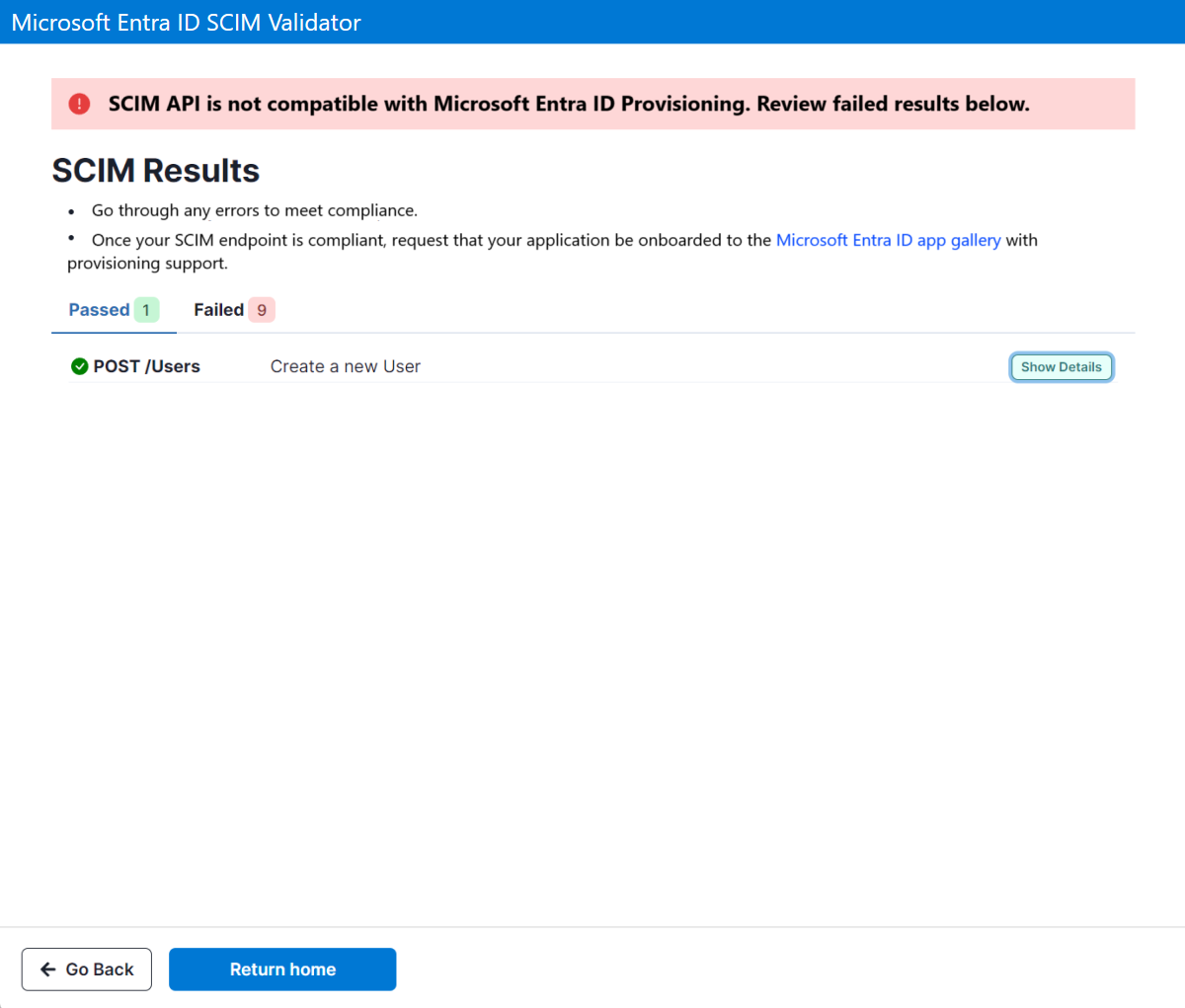 Screenshot of SCIM Validator results page.