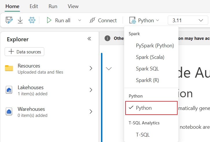 After opening a Fabric Notebook, you can switch to Python in the language dropdown menu at Home tab and convert the entire notebook set-up to Python.